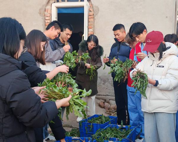 活动设“收玉—拾珍—冷餐”三个环节,为保障学校军士餐厅食材供应,同学们率先投入白菜采摘。现场分工明确、协作有序:采摘、砍菜、去根、搬运各环节高效衔接,新鲜大白菜迅速装筐码放至货车,即将端上学院餐桌。其间,军士学员尽显干练作风与优良军事素养,化工与能源学院学生默契配合、毫不逊色,戎装学员与“化工蓝”混在田间一派热火朝天的劳动景象。随后,师生们对提前收割的蒲公英进行精细分拣,摘除干枯烂叶,筛选新鲜优质嫩叶以备后续加工。看似简单的劳作,让同学们深刻体会到“粒粒皆辛苦”的真谛,锤炼了耐心与细心。劳作间隙,田埂旁的“萝卜冷餐会”别具趣味,刚出土的萝卜经简单清洗切片,成为驱散疲惫的“天然水果”,师生围坐分享劳动成果,欢声笑语弥漫田野。